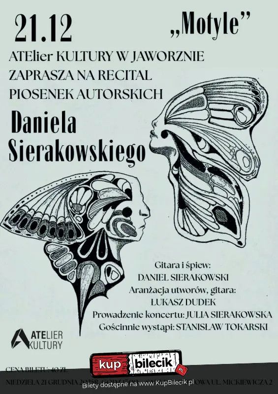 bilety: Zapraszamy na recital Daniela Sierakowskiego pod tytułem "Motyle". Gościnnie wystąpi Stanisław Tokarski. Koncert poprowadzi Julia Sierakowska. Bilety do nabycia na: KupBilecik.plDaniel Sierakowski artyści: Daniel SierakowskiZapraszamy na recital Daniela Sierakowskiego pod tytułem "Motyle". Gościnnie wystąpi Stanisław Tokarski. Bilety do nabycia na: KupBilecik.pl |