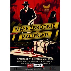 bilety: Zapraszamy na spektakl "Małe zbrodnie małżeńskie" Erica-Emmanuela Schmitta! W tej wyjątkowej inscenizacji, Teatr Oddzielny przenosi nas w świat małżeństwa, które po piętnastu latach wspólnego życia staje przed wyzwaniem odbudowy relacji. Czy amnezja głównego bohatera, wynikająca z tajemniczego wypadku, jest prawdziwym problemem, czy może to kłamstwa i ukryte prawdy są źródłem ich trudności? "Małe zbrodnie małżeńskie" to opowieść pełna zaskakujących zwrotów akcji, głębokich refleksji i emocji, które poruszają do głębi. Widzowie zostaną wciągnięci w intelektualną grę, gdzie każdy dialog i każda scena odkrywają nowe warstwy skomplikowanych relacji między mężem a żoną. Małe zbrodnie małżeńskie - Teatr Oddzielny artyści: Teatr OddzielnyW tej wyjątkowej inscenizacji, Teatr Oddzielny zabiera widzów na emocjonalną podróż, śledząc historię pary, która po piętnastu latach małżeństwa staje przed wyzwaniem odbudowy relacji. Główny bohater zmaga się z amnezją po tajemniczym wypadku, co prowadzi do pytania: czy to ona stanowi prawdziwy problem, czy raczej kłamstwa i ukryte prawdy Ten pełen zaskakujących zwrotów akcji i głębokich refleksji spektakl wciąga widzów w intelektualną grę, odkrywając kolejne warstwy skomplikowanych relacji małżeńskich z każdym dialogiem i sceną. Czy pisarza ogranicza jego własny egotyzm, czy może to podejrzliwość jego żony jest przeszkodą w ich porozumieniu A może nasze własne, nigdy nie wypowiedziane wyobrażenia o związku wpływają na te trudności Spektakl zręcznie balansuje między powagą a humorem, bawiąc, wzruszając i skłaniając do refleksji nad naszymi własnymi relacjami. Zakończenie tej historii jest nieoczekiwane i pozostawia widza z głębokimi przemyśleniami i emocjami. Bilety do nabycia na: KupBilecik.pl |