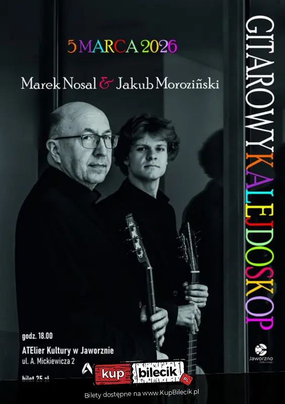 bilety: W koncercie wystąpi duo gitarowe, które tworzą: Marek Nosal - koncertujący muzyk, profesor Akademii Muzycznej w Katowicach - oraz Jakub Moroziński - solista i kameralista, laureat konkursów ogólnopolskich i międzynarodowych, absolwent katowickiej Akademii Muzycznej. Duo zaprezentuje kompozycje zróżnicowane stylistycznie, pochodzące z wielu epok muzycznych - od renesansu do naszych czasów, w tym m.in. utwory inspirowane folklorem hiszpańskim, latynoamerykańskim i polskim. Bilety do nabycia na: KupBilecik.plMarek Nosal & Jakub Moroziński artyści: Marek Nosal, Jakub MorozińskiW koncercie wystąpi duo gitarowe, które tworzą: Marek Nosal - koncertujący muzyk, uznany pedagog, profesor Akademii Muzycznej w Katowicach - oraz Jakub Moroziński - solista i kameralista, absolwent katowickiej Akademii Muzycznej, laureat konkursów ogólnopolskich i międzynarodowych. Duo zaprezentuje kompozycje na dwie gitary klasyczne pochodzące z wielu epok muzycznych - od XIX wieku do naszych czasów. Program koncertu zawiera muzykę bardzo zróżnicowaną: obok utworów zainspirowanych iberoamerykańskim folklorem, zabrzmią kompozycje nawiązujące do polskiej tradycji muzycznej, w tym romantyczne i wirtuozowskie polonezy. Bilety do nabycia na: KupBilecik.pl |
