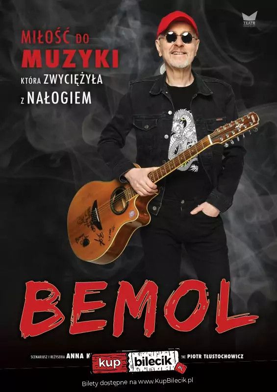 bilety: "Bemol" to głęboko emocjonalna historia oparta na prawdziwych wydarzeniach z życia Benedykta Kleszcza - jaworznianina, który dzięki sile muzyki odzyskał kontrolę nad swoim życiem i pokonał nałóg alkoholowy. Spektakl ukazuje trudną drogę bohatera zmagającego się z uzależnieniem, a jednocześnie pokazuje, jak pasja i wsparcie mogą prowadzić do odrodzenia i wewnętrznej przemiany. W spektaklu usłyszycie Państwo przeboje takich zespołów jak Smokie, The Eagles, Scorpions, Led Zeppelin, Dżem i więcej. Scenariusz i reżyseria: Anna Korczyk. Aranżacje utworów i przygotowanie sekcji wokalnej: Piotr Tłustochowicz. Czas trwania: 120 min Bilety do nabycia na: KupBilecik.plBemol artyści: Sebastian Ruciński, Kosma Kałamarz, Olek GonsiorBemol - to głęboko emocjonalna historia oparta na prawdziwych wydarzeniach z życia Benedykta Kleszcza - jaworznianina, który dzięki sile muzyki pokonał nałóg alkoholowy i odmienił swoje życie. Spektakl ukazuje trudną drogę bohatera zmagającego się z uzależnieniem, pokazując jednocześnie, jak pasja i wsparcie mogą prowadzić do odrodzenia i odzyskania kontroli nad własnym życiem. W spektaklu z muzyką na żywo usłyszycie Państwo przeboje takich zespołów jak Smokie, The Eagles, Scorpions, Led Zeppelin, Dżem i więcej. Bilety do nabycia na: KupBilecik.pl |